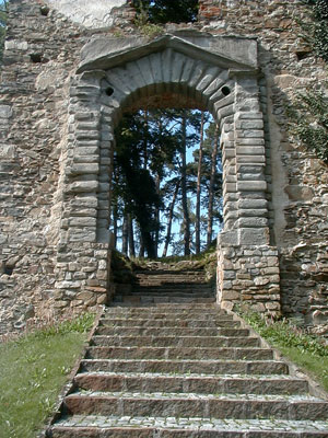 So sieht der Haupteingang heute aus. Die Steinstufen die heute hinauf zur Ruine führen, sind nachträglich angebaut. Gesichert wurde dieser Zugang durch eine Zugbrücke, die das Burgareal hermetisch abschloß wenn sie geschlossen war. Es war dies der einzige Zugang zur Burg.