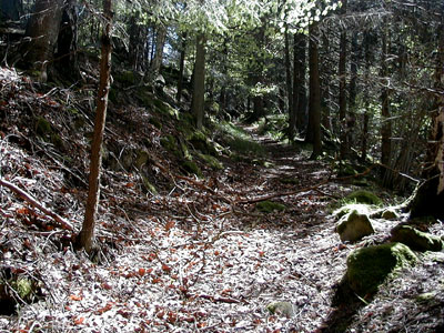 Von hier weg geht dieser Weg, der den Berg rauf führt. Er geht bald in einen Hohlweg über.