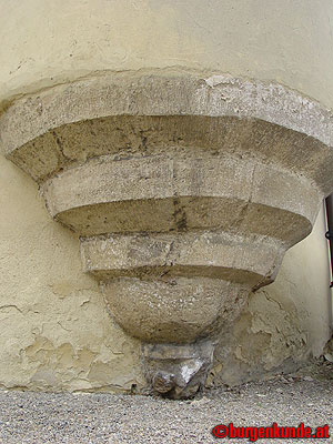 Im Osten des Karners befindet sich dieser Apsidenerker, an dessen unterem Ende eine Tierfigur zu sehen ist.