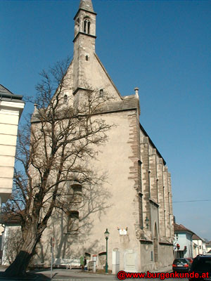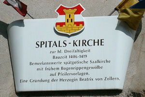 Die Spitalskirche zur Hl. Dreifaltigkeit, ein gotischer Bau, wurde von Herzogin Beatrix 1399 als zum Spital gehörige Kirche gegründet und 1406-1419 erbaut. Der einschiffige, vierjochige Bau mit 5/8-Chorschluß wirkt von außen einfach und schmucklos, nur von einem dachreiterartigen Türmchen und hohen Maßwerkfenstern aufgelockert. Im Inneren überrascht ein schönes Gewölbe mit sternförmigen Rippen. Bemerkenswert ist die zweiteilige Orgelempore mit gotischem Orgelfuß. Der neugotische Hochaltar stammt aus der Pfarrkirche (1951 übernommen). Vom Bürgerspital selbst sind nur unbedeutende Reste erhalten.